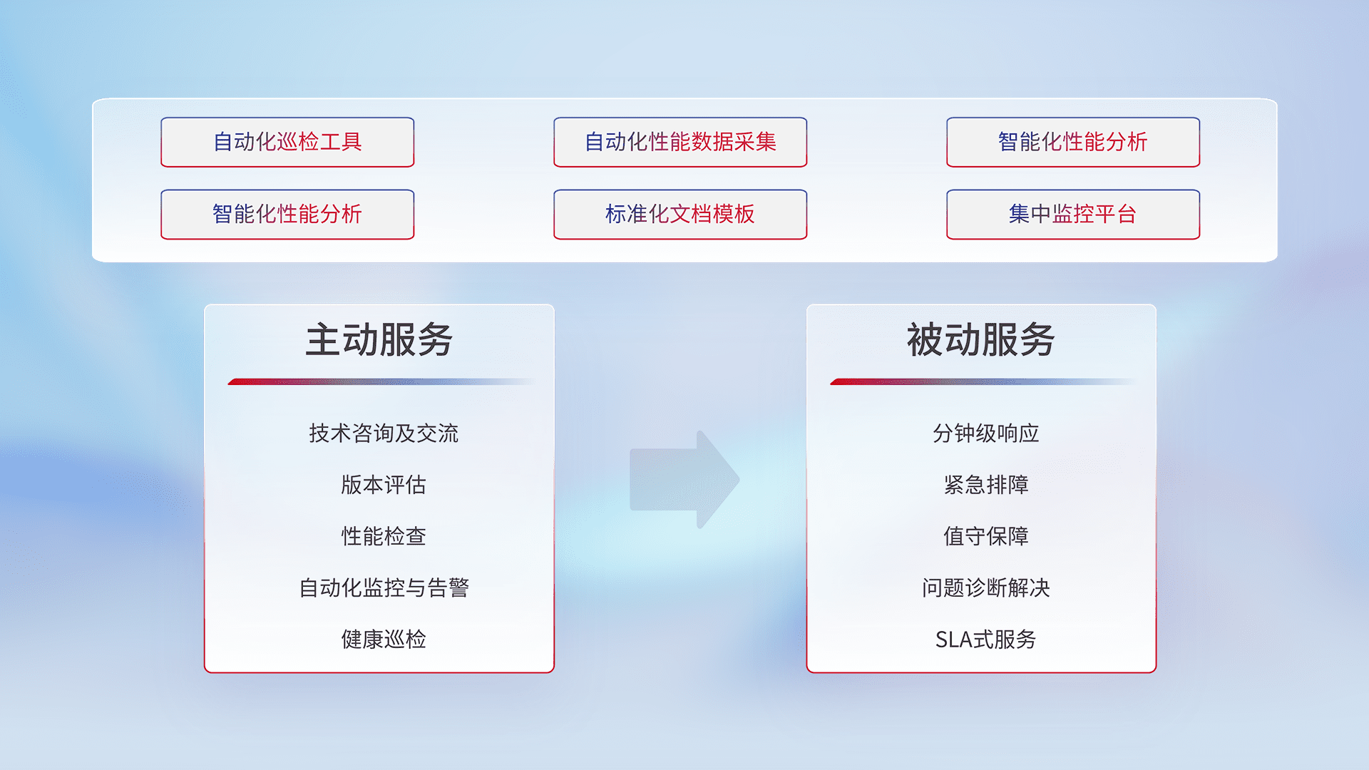 智能化工具和标准化文档,,,,保障服务质量,,,,提供主动服务(包含技术咨询、、、版本评估、、性能检查、、自动化监控与告警、、健康巡检)和被动服务包含(分钟级响应、、、紧急排障、、、、值守保障、、问题诊断解决、、SLA服务)。。。。